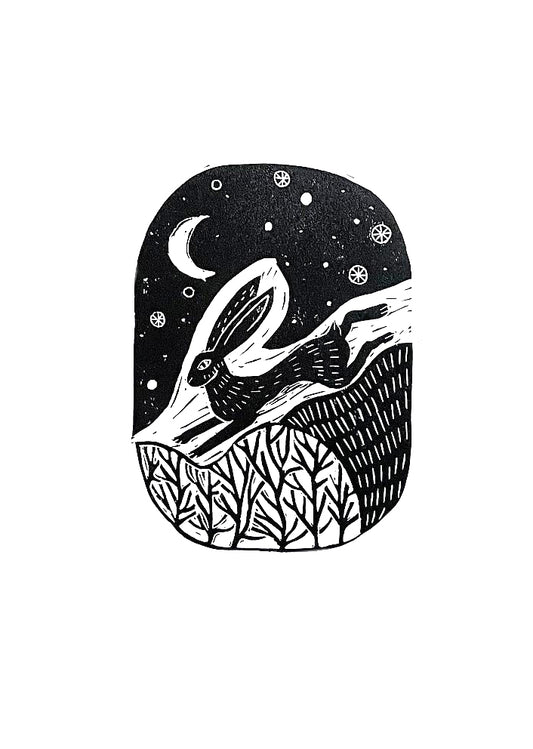 Original Lino Print - Hares Under the Moon and Sun
